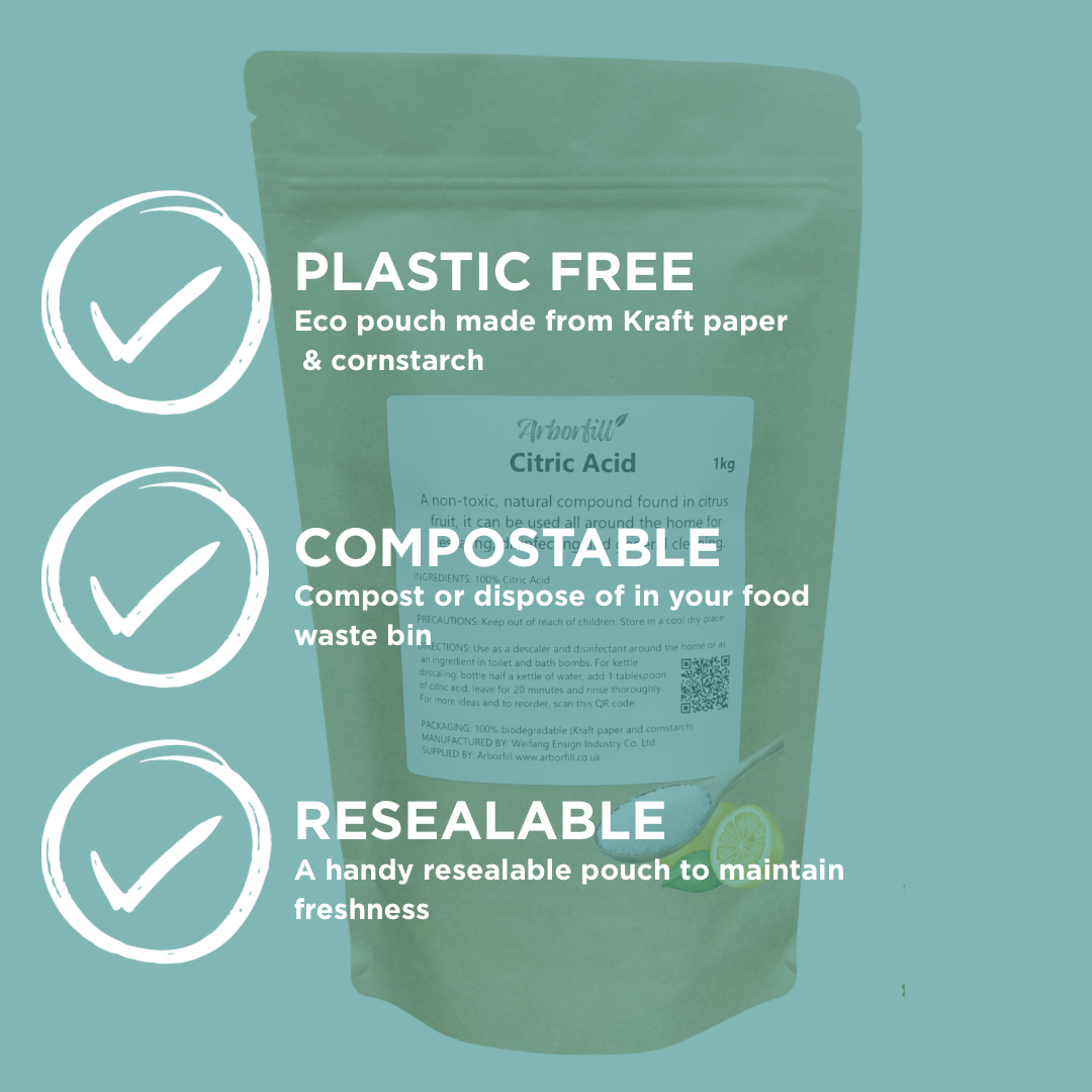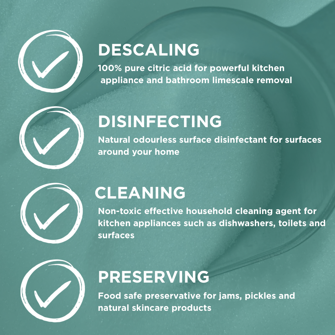 Citric acid is a natural compound that is found in citrus fruit. It has so many uses around the home such as descaling, cleaning and cooking. It is odourless and colourless and can be used as a disinfectant against bacteria. Non-toxic and safe to use in homes with children and pets. If you want to remove limescale from your appliances, clean your dishwasher, make bath bombs and toilet fizzies, or preserve food and make preserves, then this is the product for you.