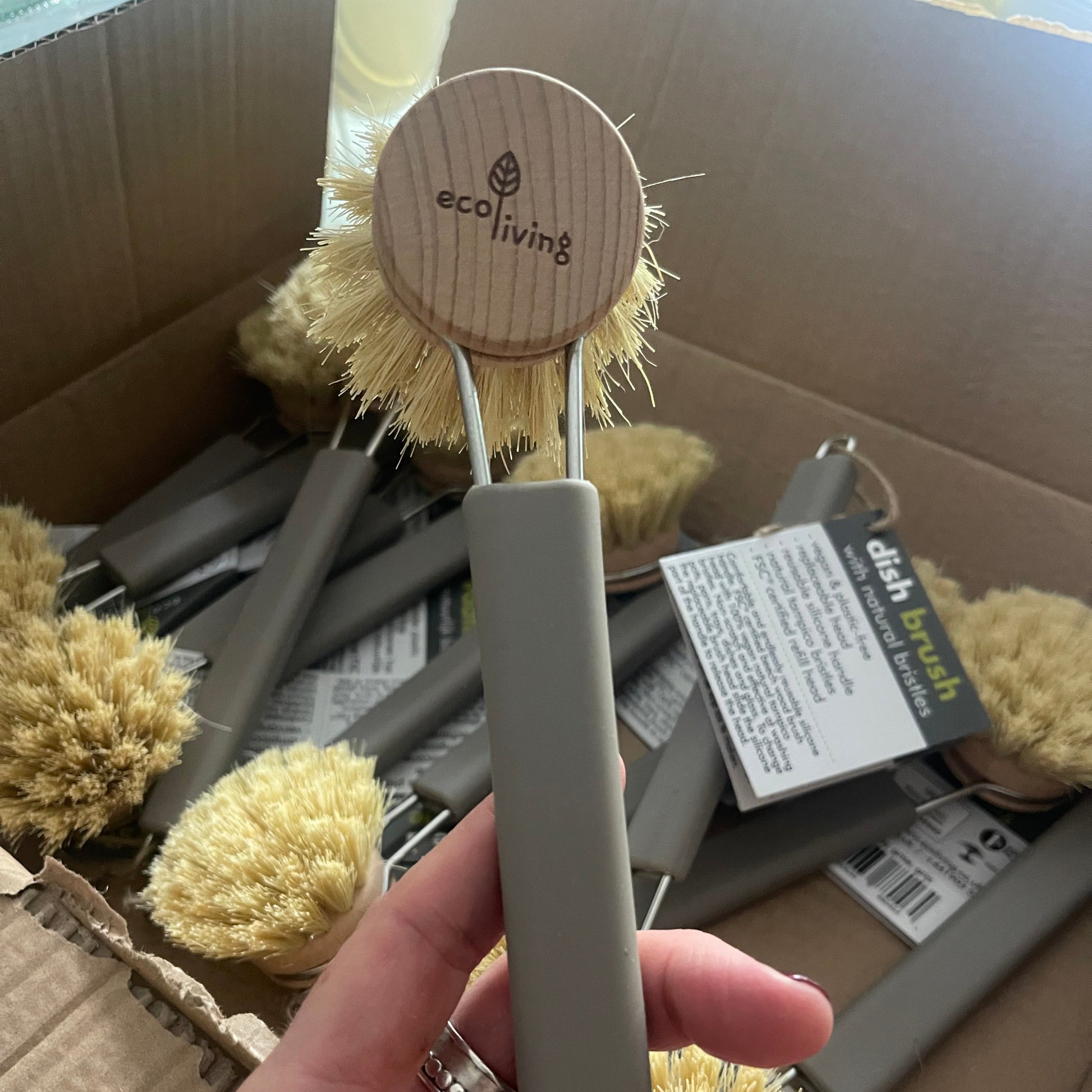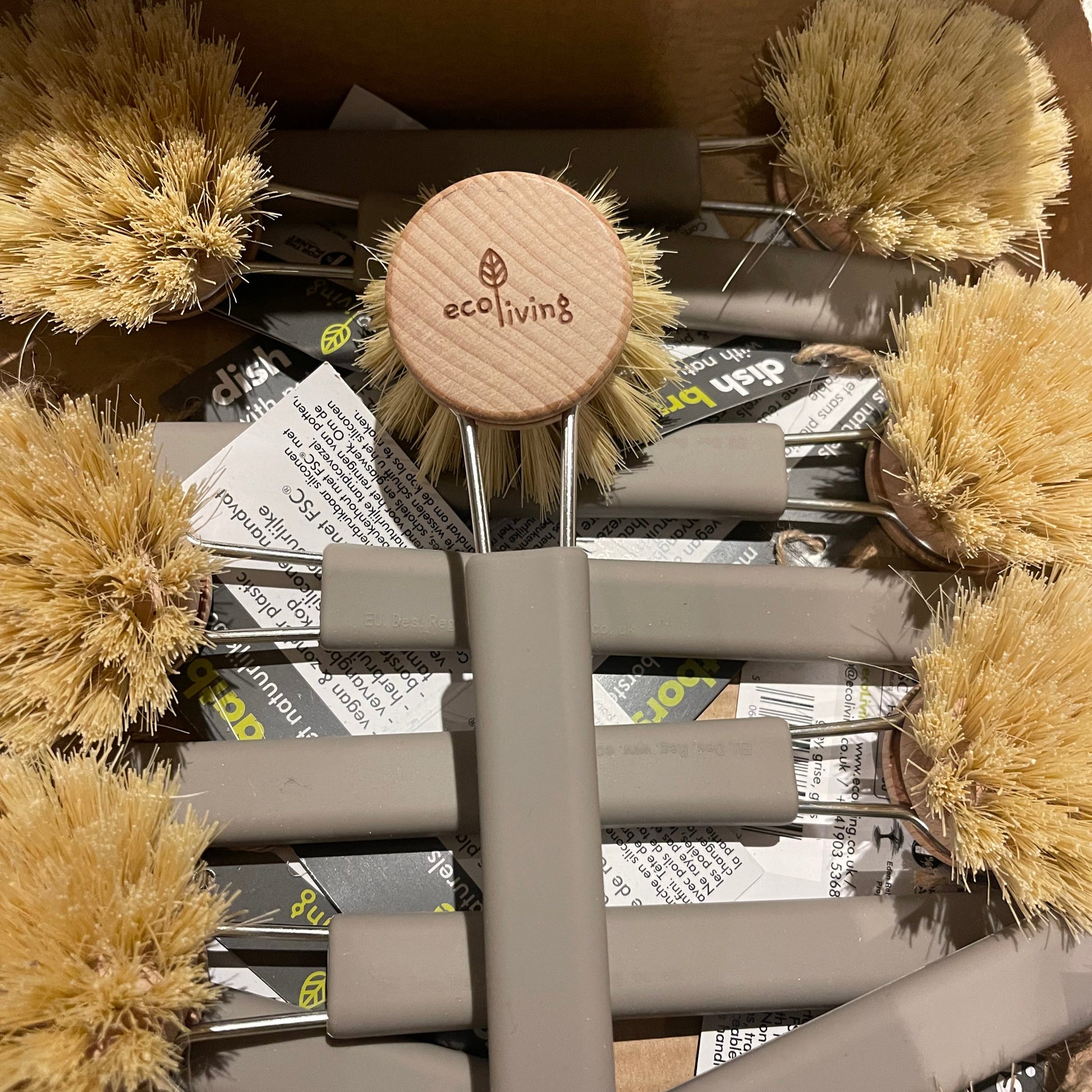 Long handled brush with natural plant bristles for scrubbing pots and pans. The silicon and stainless steel handle is endlessly reusable. The beech wood and sisal brush head is replaceable, making this an even longer lasting and sustainable product.