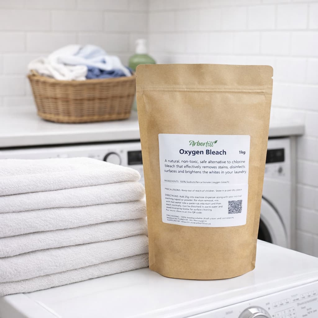 Oxygen bleach (sodium percarbonate) is a natural cleaning agent that releases oxygen when dissolved in water. It breaks down into hydrogen peroxide and sodium carbonate—both biodegradable and non-toxic.